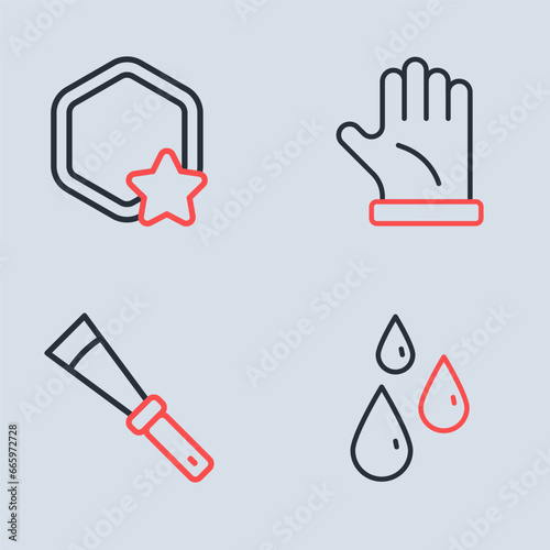 Set line Beekeeper glove, Beekeeping knife, Drops of honey and Honeycomb icon. Vector