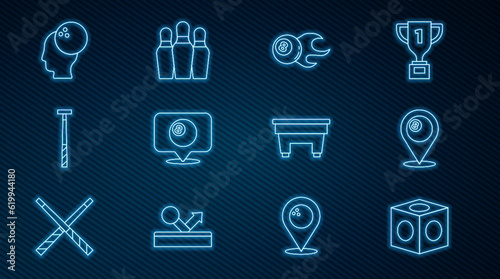 Set line Billiard chalk, Location with billiard ball, cue, Bowling, table and pin icon. Vector