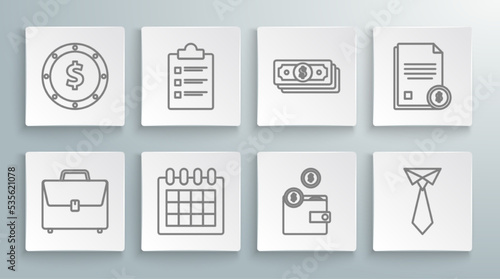 Set line Briefcase, Clipboard with checklist, Calendar, Wallet coins, Tie, Stacks paper money cash, Finance document and Coin dollar symbol icon. Vector