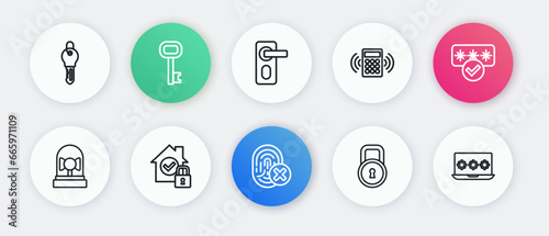 Set line Cancelled fingerprint, Password protection, Ringing alarm bell, Lock, Security keypad access panel, Fingerprint door lock, Laptop with password and House under icon. Vector