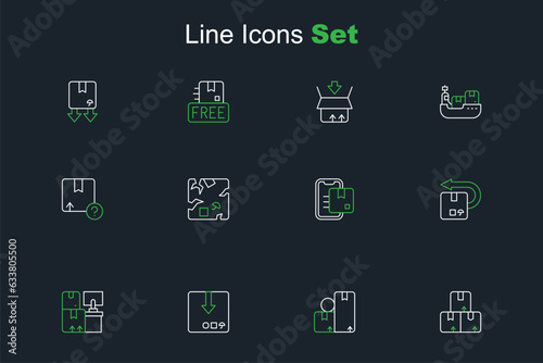 Set line Carton cardboard box, Warehouse with boxes, Return, Document tracking marker, Broken and icon. Vector