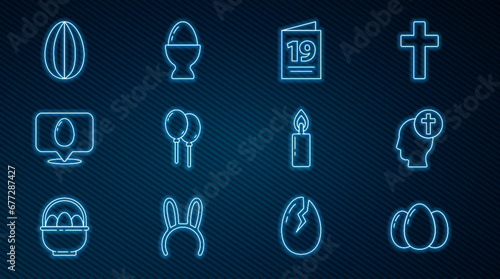 Set line Easter eggs, Human head with christian cross, Greeting card Happy, Balloons ribbon, Speech bubble easter, Burning candle and stand icon. Vector