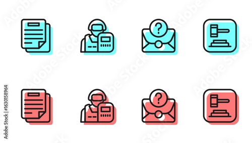Set line Envelope with question mark, Document, Police officer and Judge gavel icon. Vector