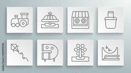 Set line Kite, Attraction carousel, Kid playground slide pipe, Ferris wheel, Skate park, Shooting gallery, Sand bucket and Toy train icon. Vector