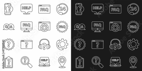 Set line Location with gear, Telephone 24 hours support, Label text FAQ, Browser, Computer monitor and, Question Answer, Mobile question and setting icon. Vector