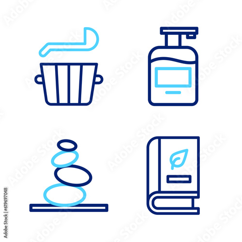 Set line Medical book, Stack hot stones, Bottle of liquid soap and Sauna bucket and ladle icon. Vector