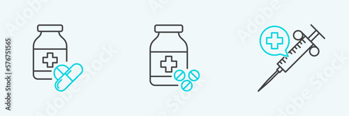 Set line Medical syringe with needle, Medicine bottle and pills and icon. Vector