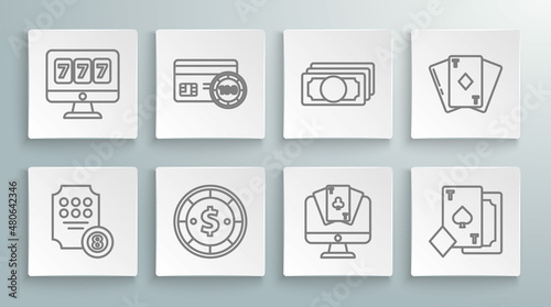 Set line Online slot machine, Credit card, Casino chip with dollar, poker table game, Playing spades, Stacks paper money cash, diamonds and lucky sevens jackpot icon. Vector