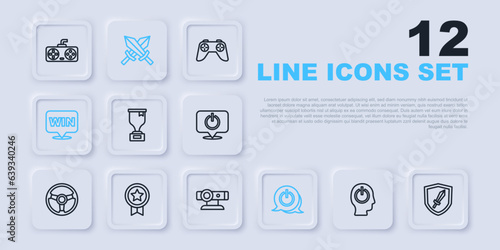 Set line Power button, Sword for game, Award cup, Medal, Game rating with medal, and Web camera icon. Vector