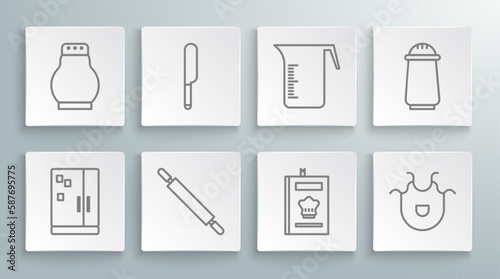 Set line Refrigerator, Knife, Rolling pin, Cookbook, Kitchen apron, Measuring cup, Salt and pepper and icon. Vector
