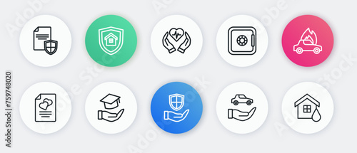 Set line Shield in hand, Burning car, Marriage contract, Car insurance, Safe, Life, House flood and Education grant icon. Vector