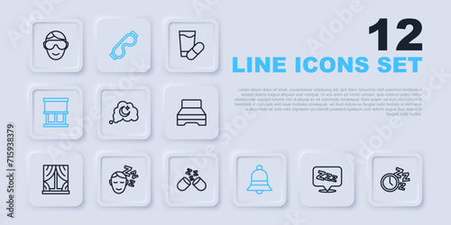 Set line Sleepy, Alarm clock, Dreams, Ringing bell, Window with curtains, Eye sleep mask and Sleeping pill icon. Vector