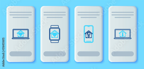 Set line Smart watch with smart home with wi-fi, Mobile phone house and light bulb, Laptop and temperature icon. Vector