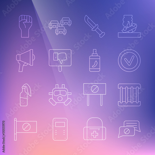 Set line Speech bubble chat, Prison window, Check mark round, Military knife, Protest, Megaphone, Raised hand with clenched fist and Pepper spray icon. Vector