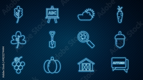 Set line Speech bubble with text autumn, Acorn, Sun and cloud weather, Shovel, Leaf leaves, Magnifying glass leaf and Chalkboard icon. Vector