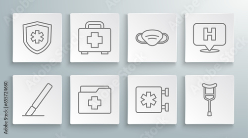 Set line Surgery scalpel, First aid kit, Patient record, Emergency - Star of Life, Crutch crutches, Medical protective mask, Location hospital and insurance icon. Vector