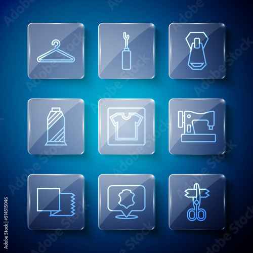 Set line Textile fabric roll, Leather, Scissors, Zipper, Sewing pattern, thread on spool, Hanger wardrobe and machine icon. Vector