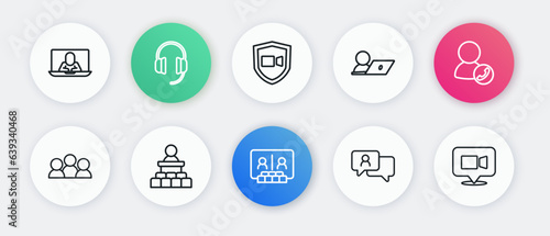 Set line Video chat conference, Meeting, Speech bubble, and Speaker icon. Vector