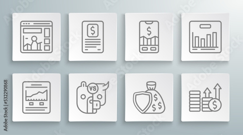 Set line Website with growth graph, Business finance report, Bull and bear of stock market, Shield money bag, Financial dollar, Mobile trading, Pie chart infographic and icon. Vector