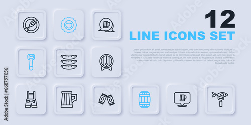 Set line Wooden beer mug, Dried fish, Sausage, barrel, Bottle opener, and Beer can icon. Vector