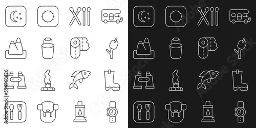 Set line Wrist watch, Waterproof rubber boot, Marshmallow on stick, Match, Bucket, Mountains, Moon and stars and Paper towel roll icon. Vector