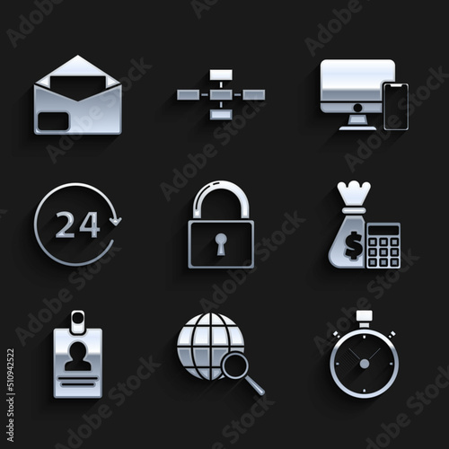 Set Lock, Magnifying glass with globe, Stopwatch, Calculator money bag, Identification badge, Clock 24 hours, Computer monitor and mobile phone and Envelope icon. Vector