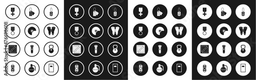 Set Military dog tag, helmet, reward medal, Binoculars, Kettlebell and ammunition box icon. Vector