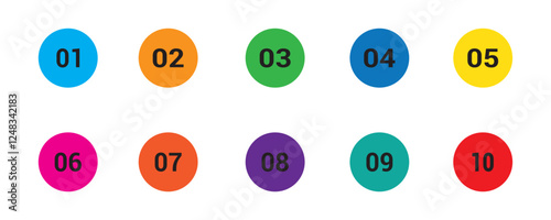 Set of 1 to 10 Colorful Bullet numbers point simple design isolated. Typography set of Round 1 to 10 numbers. Numeral typographic flat icons set. Bullet point number icon set.