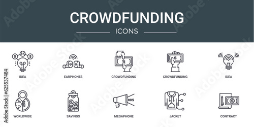 set of 10 outline web crowdfunding icons such as idea, earphones, crowdfunding, crowdfunding, idea, worldwide, savings vector icons for report, presentation, diagram, web design, mobile app