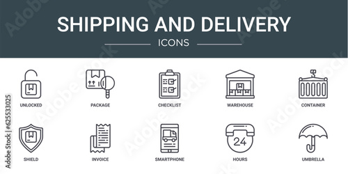 set of 10 outline web shipping and delivery icons such as unlocked, package, checklist, warehouse, container, shield, invoice vector icons for report, presentation, diagram, web design, mobile app