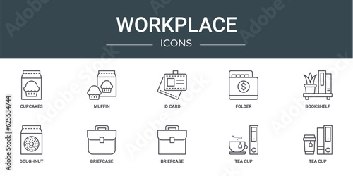 set of 10 outline web workplace icons such as cupcakes, muffin, id card, folder, bookshelf, doughnut, briefcase vector icons for report, presentation, diagram, web design, mobile app