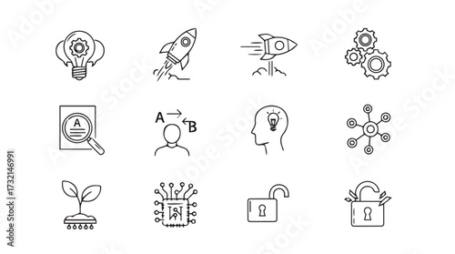 icon, set, business, technology, innovation, growth, startup, idea, light bulb, rocket, datum, analysis, brain, network, ai, artificial, intelligence, germ bud, plant, chips, circuit, lock, unlock, cloud, upload, download, hand-drawn, vignetting, outline, concept, symbol