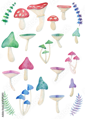 Set of 17 mushrooms and 4 herbs. Watercolor painting for textile, covering, linen and etc