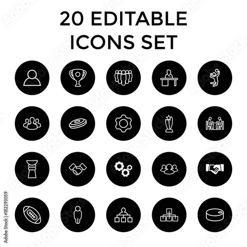 team, icon, gear, handshake, structure, user, hockey, puck, group, man, working, at, the, table, meeting, volleyball, player, american, football, trophy, outline, set, vector, illustration, symbol, background, isolated, business, design, graphic, people, human, signs, teamwork, silhouette, work, person, sport, web, black, office, white, concept, equipment