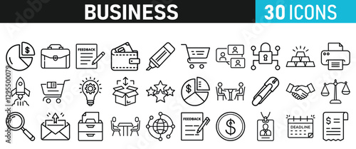 Set of 30 Business icons. Business web icons in line style. Money, bank, contact, infographic, balance. Icon collection. Vector illustration.