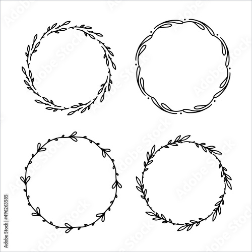 Set of 4 hand drawn spring wreaths isolated on white background, vector. Outline frames of leaves. Doodle style.Collection of floral monogram frames.