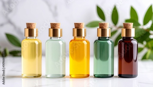 Set of 5 colorful essential oil bottles with cork stoppers on marble background.