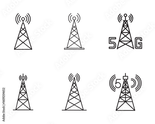Set of 5G Cellular Tower Icons Line Art Style for Telecommunications Infrastructure and Network Connectivity