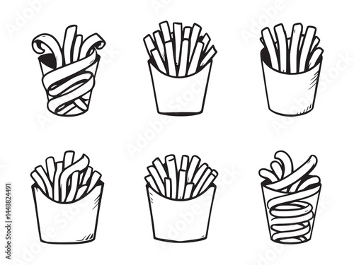 Set of 6 pcs Different type of Curly Fries Clear Vision Simple Line Art on White Background
