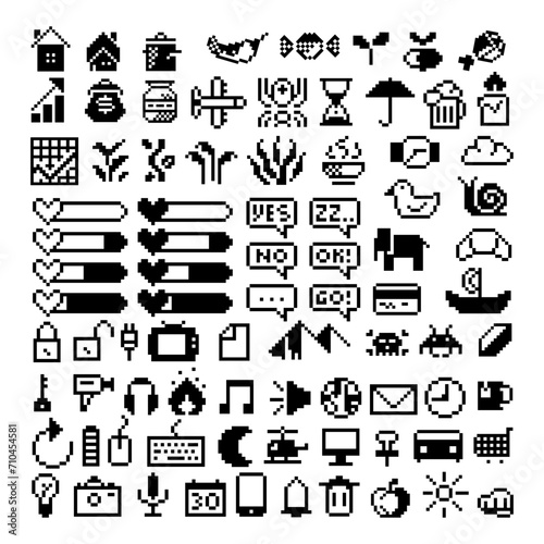 vector, icon, design, retro, buttons, speech bubble, cassette, sticker, illustration, pixel, game, cyberspace, cursor, background, set, black-and-white, note, shopping cart, video, graphic, level, symbol, letter, start, music, camera, 90s, phone, hourglass, off, dialogue, 80s, silhouette, arcade