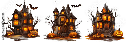 Set of A cozy front porch decorated for Halloween with an array of carved pumpkins on transparent png background