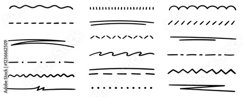 Set of abstract curved hand drawn lines, underline, highlight lines, underline strokes, scribbles, dots, dashes. Wavy, straight, curved lines.