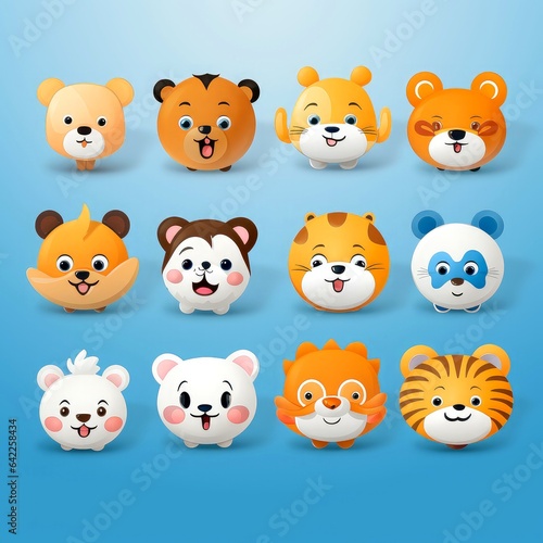 Set of animal faces, face emojis, stickers, emoticons,cartoon funny mascot characters face set, Generative AI illustration
