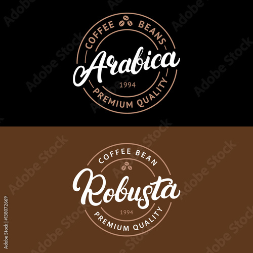 Set of Arabica and Robusta coffee hand written lettering logo, label, badge, emblem.