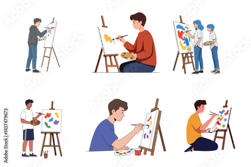 artist, painter, art, painting, drawing, creative, hobby, profession, occupation, job, work, easel, canvas, brush, palette, paint, apron, person, people, man, woman, character, illustration, vector, flat, graphic, standing, kneeling, sitting, working, holding, posing, set, collection, group, isolated, white background, male, female, young adult, youth, studio, workshop, creating, artwork, artistic, talent, skill
