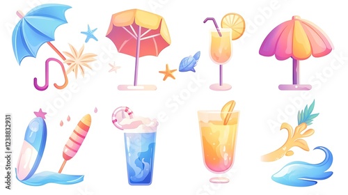 Set of beach holiday-themed icons including umbrellas, cocktails, and waves.