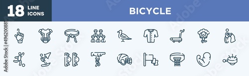 set of bicycle icons in outline style. bicycle thin line icons collection. foam hand, chest guard, belts, baseball team, seagulls, baseball jersey vector.