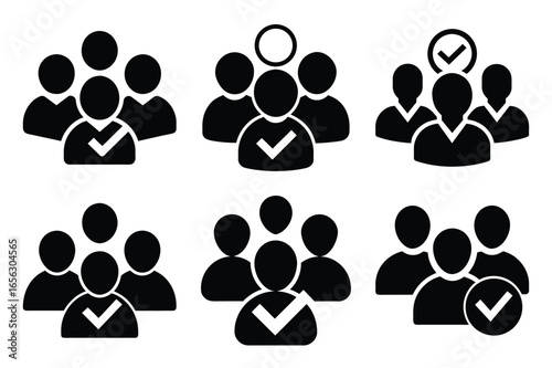 set of black and white icons of groups of people with checkmarks and circles silhouette team