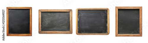 Set of black blank chalkboards with wood frame isolated on transparent background