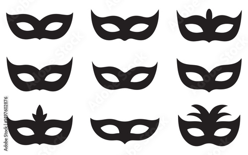 Set of black masquerade masks in different styles, perfect for costume parties, events, and creative design projects related to mystery, disguise, and elegance.